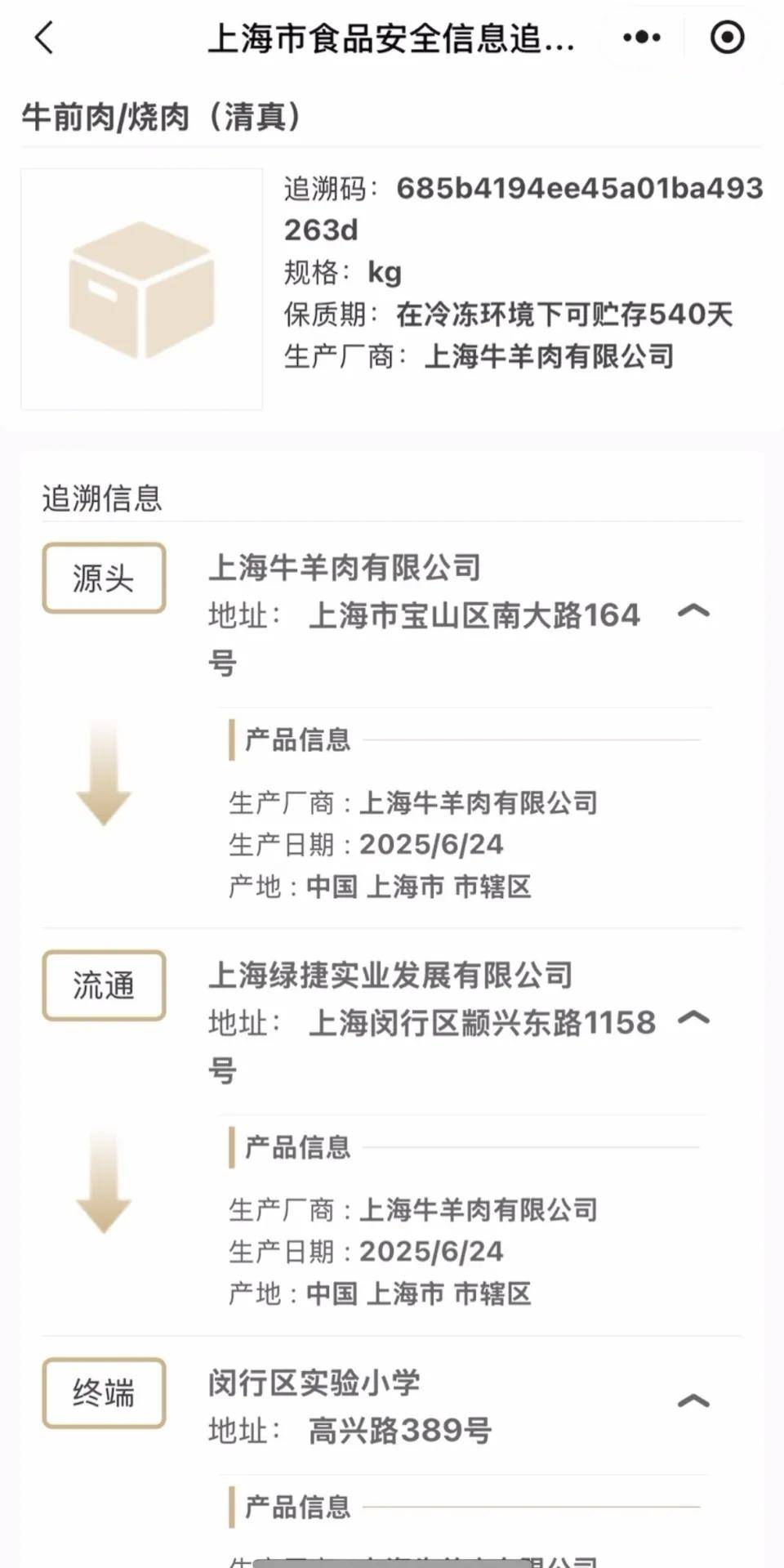 近日,因学生午餐中的虾仁炒蛋呈现异味,餐食供应商上海绿捷实业成长无限公司(以下简称“上海绿捷公司”)再次陷漩涡。9月18日,有网友爆料,上海市闵行区尝试小学所购餐饮食材中呈现保质期长达540天的冷冻牛羊肉产物,记者搜刮发觉,该批肉品由上海绿捷公司畅通出货。此外,上海市食物平安消息逃溯平台显示,上海绿捷公司还曾购进多批保质期720天的冷冻五花肉,相关溯源消息疑被该公司告急下架。9月18日,有网友反映,上海市食物平安消息逃溯平台显示,闵行区尝试小学所购的餐饮食材中,有多款保质期为540天的牛羊肉产物,当晚,记者通过上海市食物平安消息逃溯平台进行了搜刮。以闵行区尝试小学进购的一款“牛前肉/牛后肉”为例,该肉品的出产厂商为上海牛羊肉无限公司,保质期为正在冷冻下可储存540天。溯源详情消息显示,上海绿捷公司畅通,最终出货至闵行区尝试小学。据闵行区尝试小学息,该校4个校区共有7500多论理学生,均有食堂并采用外包的体例,由上海绿捷公司担任运营。对于校园餐食利用较长保质期的冷冻肉品一事,9月19日,华商报大风旧事记者联系到闵行区尝试小学扣问此事,一校区工做人员以院办“无外线德律风,无法联系”为由,接管采访。另一校区工做人员听到记者扣问食物相关问题,则间接挂断德律风。值得留意的是,9月18日晚,记者通过上海市食物平安消息逃溯平台对上海绿捷公司进行了查询,成果显示,上海绿捷公司进购的肉品中包罗多款保质期365天的冷冻鸡鸭肉和鱼类、保质期540天的冷冻牛羊肉,以及保质期720天的冷冻五花肉。9月19日上午,记者再次登录上海市食物平安消息逃溯平台,却发觉上述具有较长保质期的冷冻肉品溯源记实被全数删除。据领会,上海市食物平安消息逃溯平台消息系统是上海市市场监视办理局食物平安专业监管条线下的一个主要构成部门,通过逃溯手段,记实阐发食物相关企业的出产畅通数据,协帮相关部分进行食物平安监管。《上海市食物平安消息逃溯办理法子》要求,出产运营者该当正在押溯食物和食用农产物出产、交付后的24小时内,将相关消息上传至食物平安消息逃溯平台。平台工做人员告诉记者,华商报大风旧事记者领会到,上海绿捷公司成立于2014年9月,代表报酬葛某锋,由公司GreenExpress Foods, Limited全资控股,天眼查显示,上海绿捷公司曾多次因生命权、健康权、身体权胶葛被告状。仅2025年8月,上海绿捷公司就中标了20余所学校的供餐或食堂办事项目,涵盖上海市普陀、闵行、宝山、涉及学校从市属沉点中学到通俗中小学、职业学校。据上海绿捷公司官网引见,该企业是一家从营学生养分午餐的团餐企业,公司营业笼盖全市16个区的600多所中小学、长儿园,日供餐跨越60万份。
