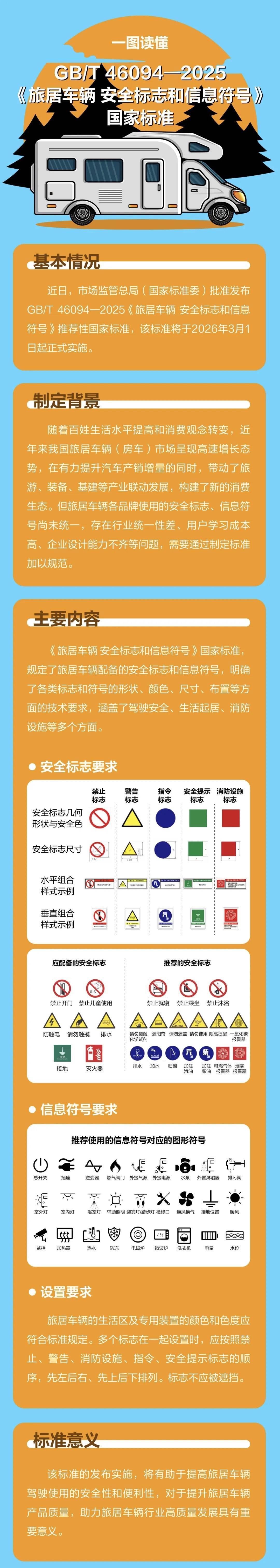 为规范客居车辆设想、出产和利用,市场监管总局(国度尺度委)组织制定了《客居车辆 平安标记和消息符号》(GB/T46094—2025)国度尺度,了客居车辆配备的平安标记和消息符号,明白了各类标记和符号的外形、颜色、尺寸、安插等方面的手艺要求,涵盖驾驶平安、糊口起居、消防设备等多个方面。